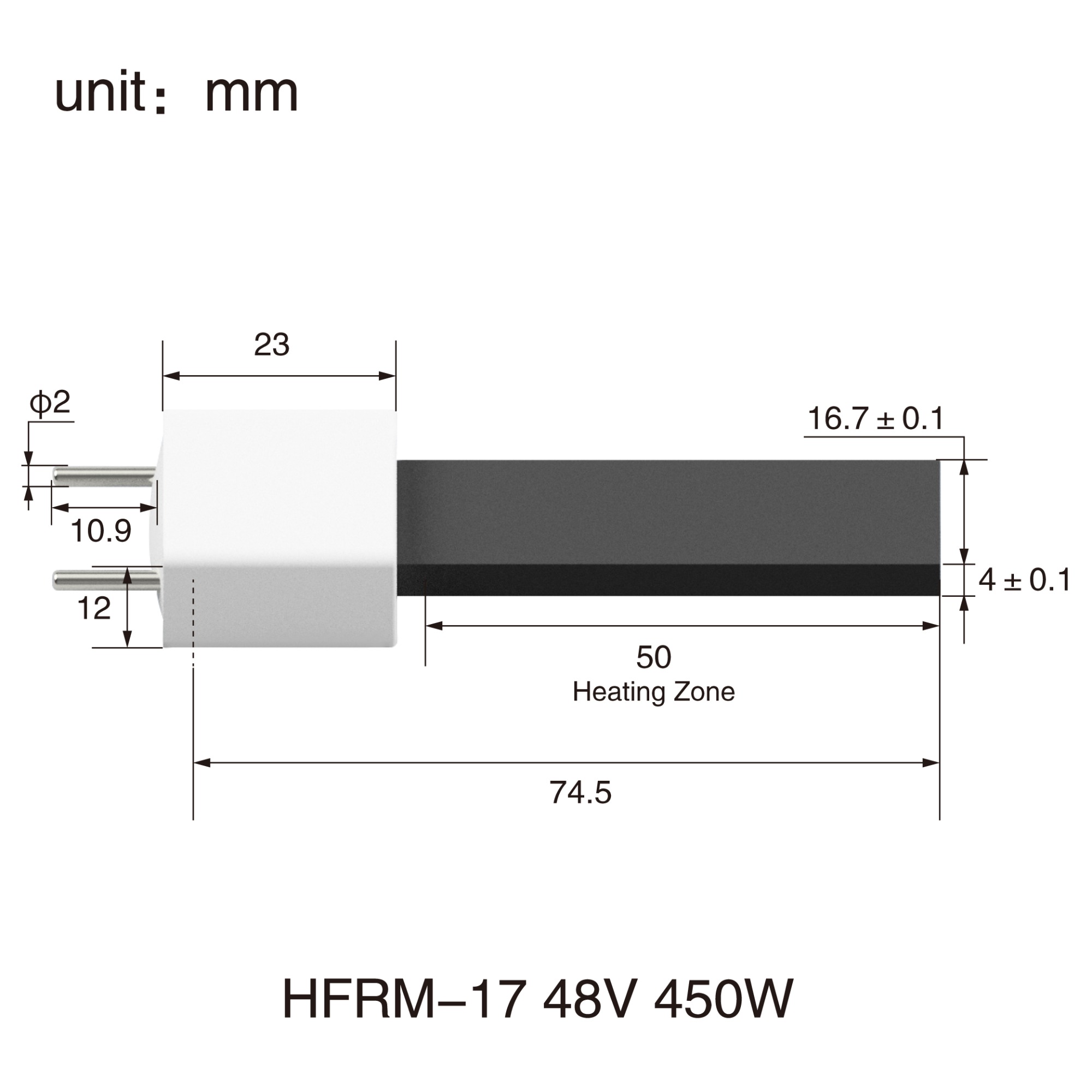 The Spark Ignitor, model HFRM-17, is crafted from high-quality Silicon Nitride (Si3N4), ensuring robustness and reliability. It operates at 48V with a power output of 450W, making it suitable for a wide range of ceramic heating applications. The ignitor features a compact size of 4x17x75mm with a 50mm heating zone, facilitating easy integration into existing systems. Its flange options include ceramic, stainless steel, copper, or customized materials, catering to diverse installation requirements.